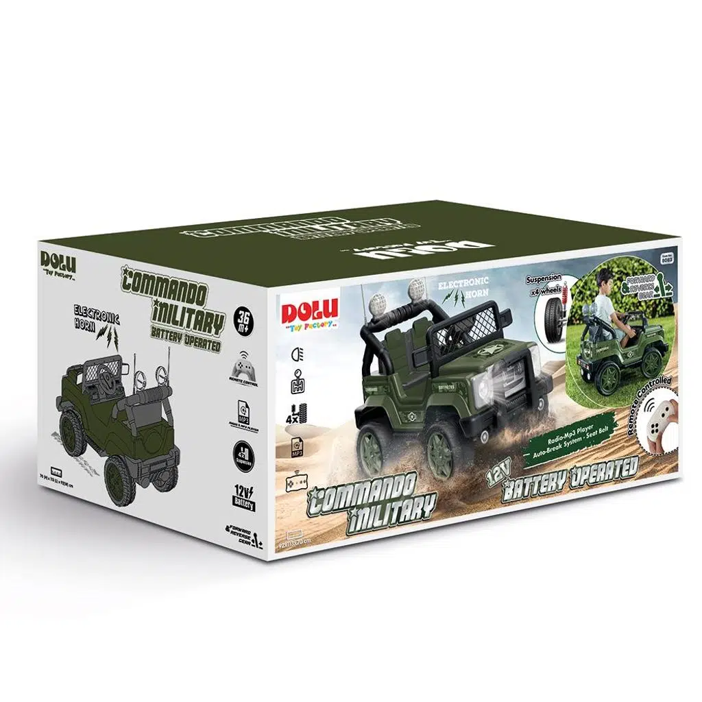 36 ay ve üzeri çocuklar için uygundur. 92x113x70 cm ölçülerindedir. 12 volt akülüdür. Uzaktan kumanda edilebilir. Otomatik fren sistemi mevcuttur. Şarj aleti ürünle birliktedir. İleri ve geri viteslidir. Amortisörlüdür. Ön farları ışıklı, tepe lambaları aksesuardır. Sağlam ve dayanıklıdır. İç ve dış mekanda kullanılabilir.