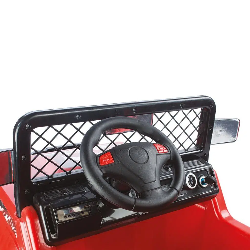36 ay ve üzeri çocuklar için uygundur. 92x113x70 cm ölçülerindedir. 12 volt akülüdür. Uzaktan kumanda edilebilir. Otomatik fren sistemi mevcuttur. Şarj aleti ürünle birliktedir. İleri ve geri viteslidir. Amortisörlüdür. Ön farları ışıklı, tepe lambaları aksesuardır. Sağlam ve dayanıklıdır. İç ve dış mekanda kullanılabilir.
